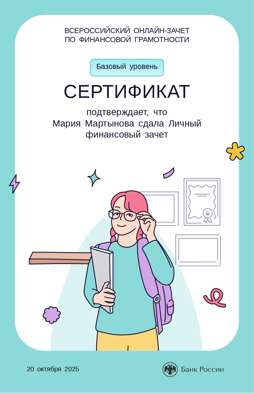 Сертификат Всероссийского онлайн-зачета по финансовой грамотности от 20.10.2025 г.